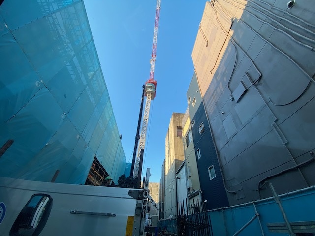 おはようございますっ。 寒さが日に日に増してます。 お街のど真ん中のタワークレーン設置現場です。躯体工事完了は...