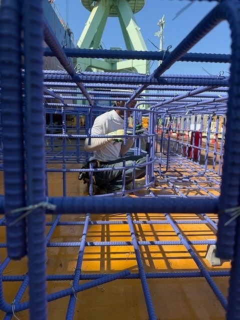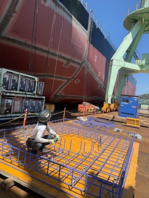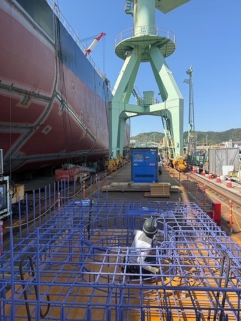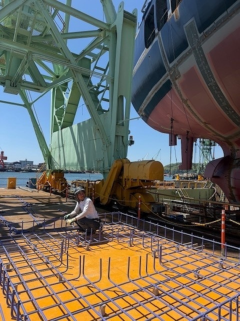 大型船の横で機械基礎の組立てでした。